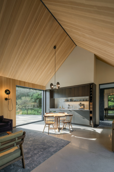 Объемы соединены стеклянным переходом и входным вестибюлем. Внутри остроконечных форм располагаются спальни и ванные комнаты, а промежуточные пространства между ними и внешней оболочкой предлагают многослойный пространственный опыт, обрамляющий прекрасные виды на природу.